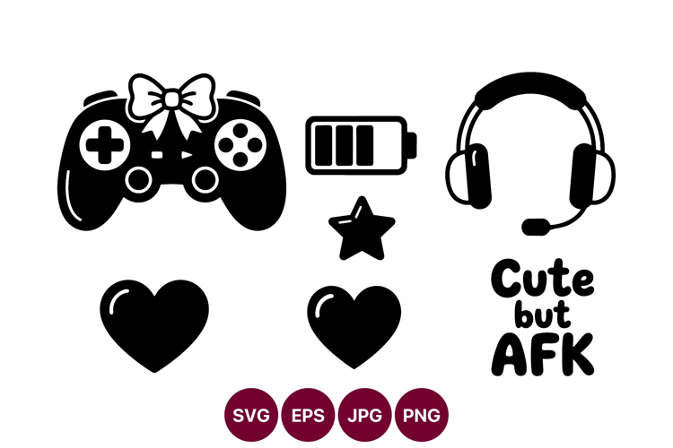 A black vector composition showing a game controller with a bow battery icon headset and hearts beside a cute afk caption
