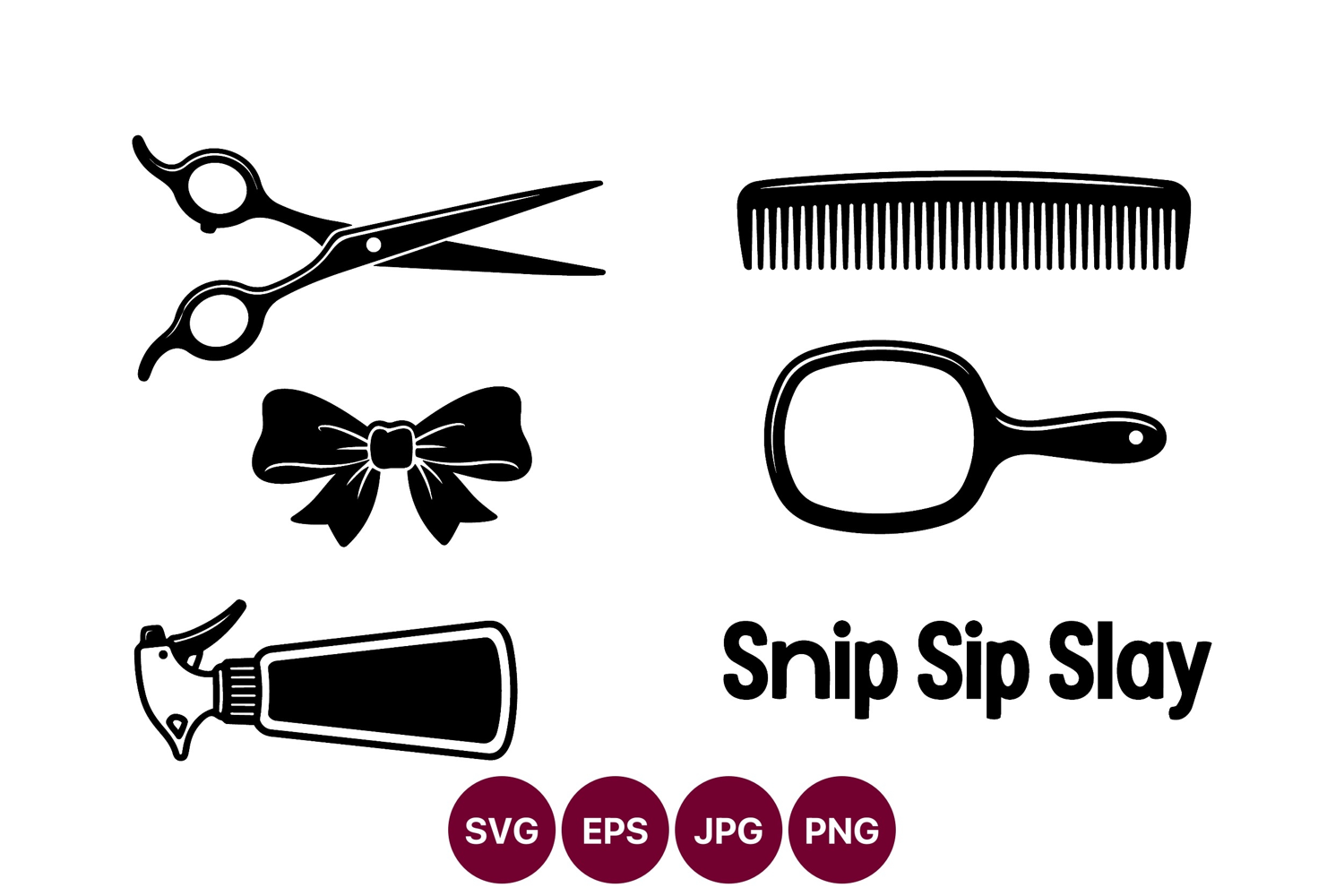 A black vector collage of scissors, comb, razor, bow, and mirror handle with the bold words snip sip slay in a clean line art style