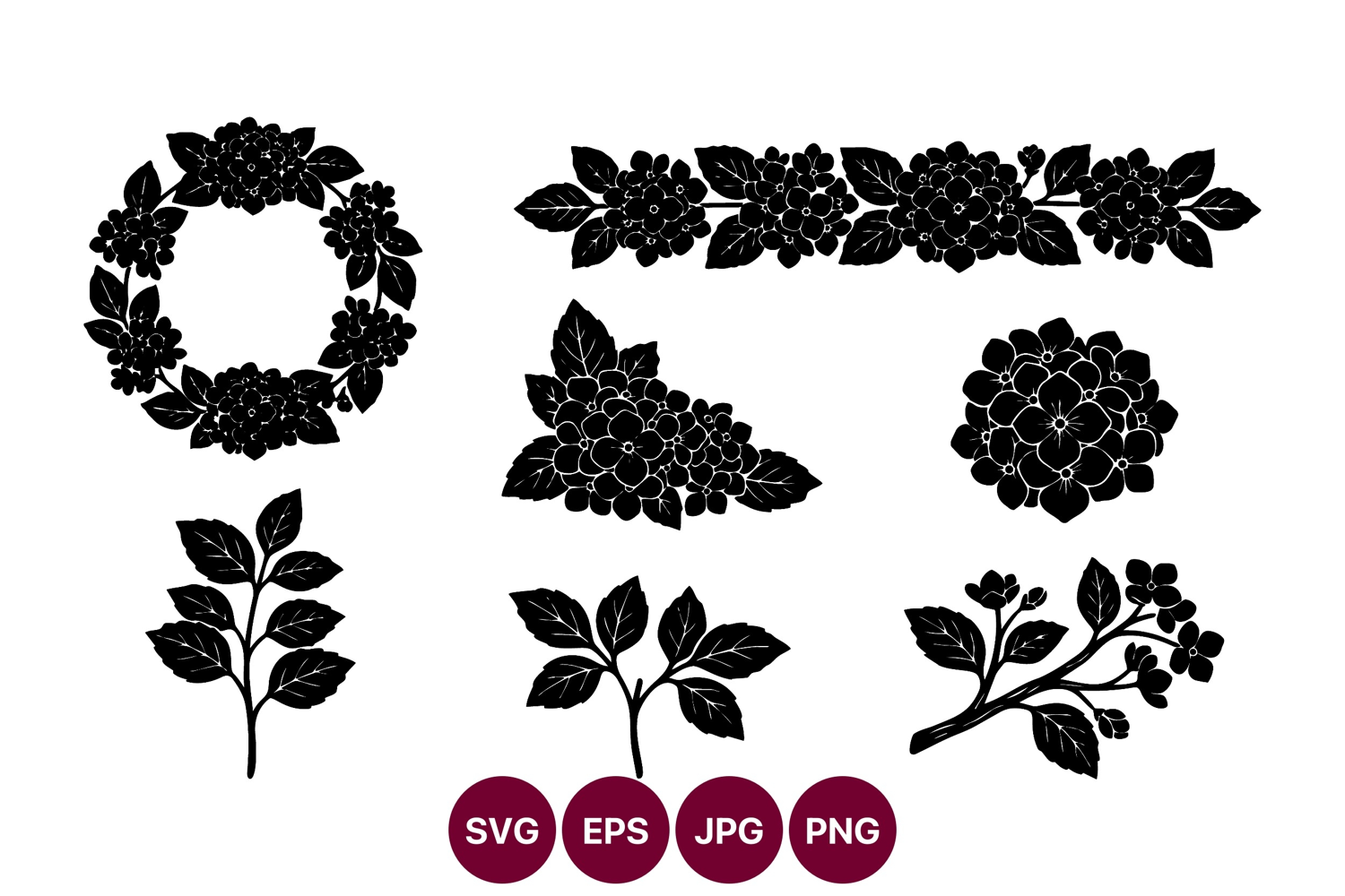 Black floral silhouettes including wreaths branches and bouquets for vintage style designs and decorative projects