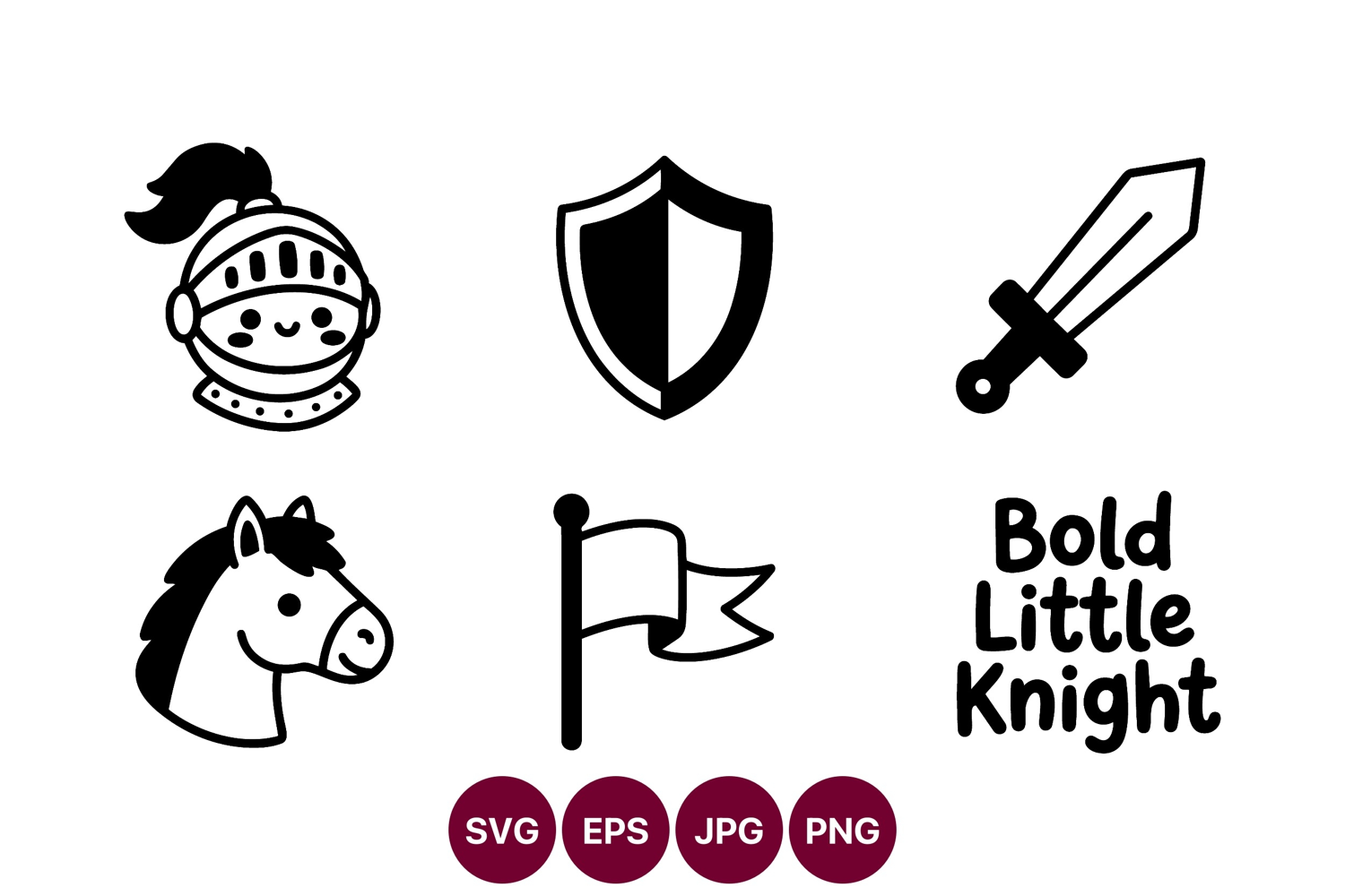 Black and white vector featuring knight icons such as helmet shield sword horse head and flag with bold playful vibe
