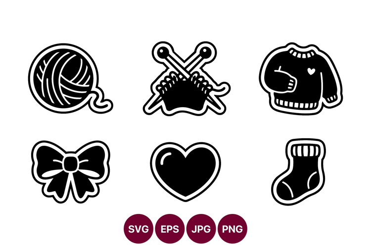 Square of black and white line art icons featuring yarn ball, crossed needles, sweater, bow, heart, and sock.