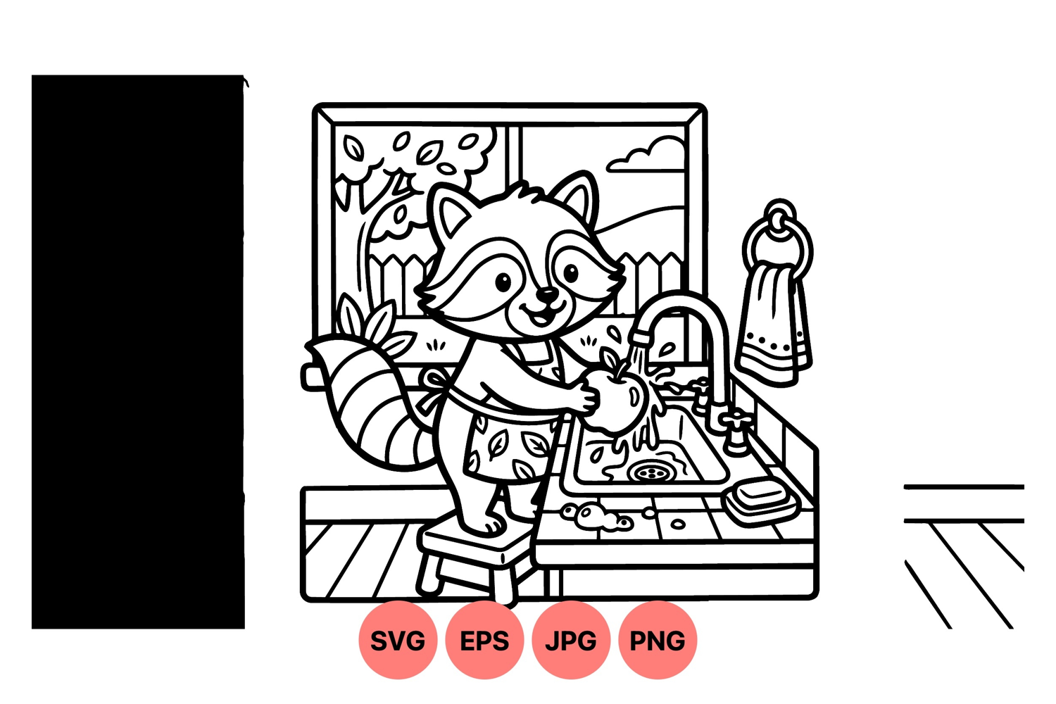 Nursery Wall Art Cute Animal Clipart Black And White Svg Svg Cut File Design Kids Activity Clipart Playful Animal Illustration Cartoon Character Design Children Coloring Svg Raccoon Washing Apples Kitchen Scene Drawing