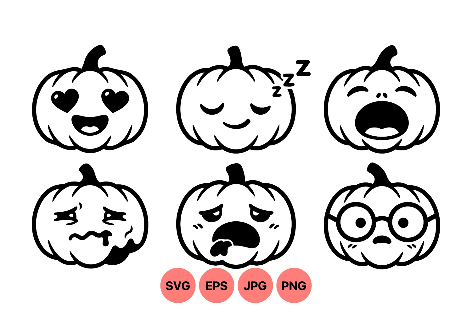A monochrome vector of six pumpkin faces expressing various emotions such as love sleepiness yawning sadness sickness and intelligence suitable for halloween designs playful and quirky style