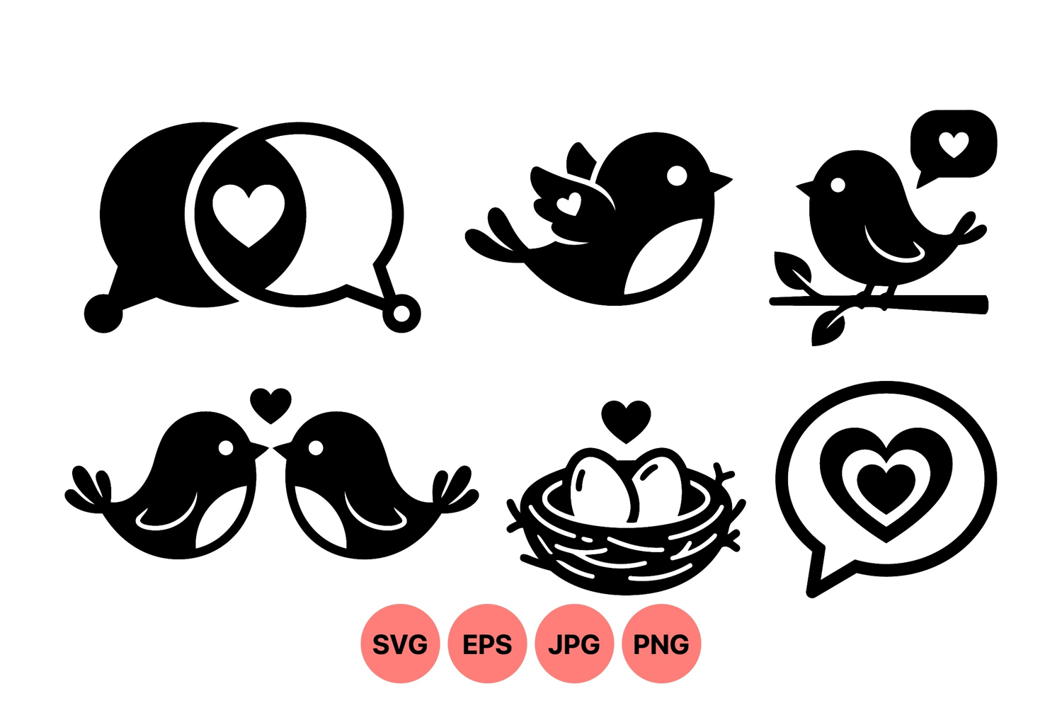 Vector art of black love bird icons and heart speech bubbles with nest and eggs details representing love and communication in a minimal style