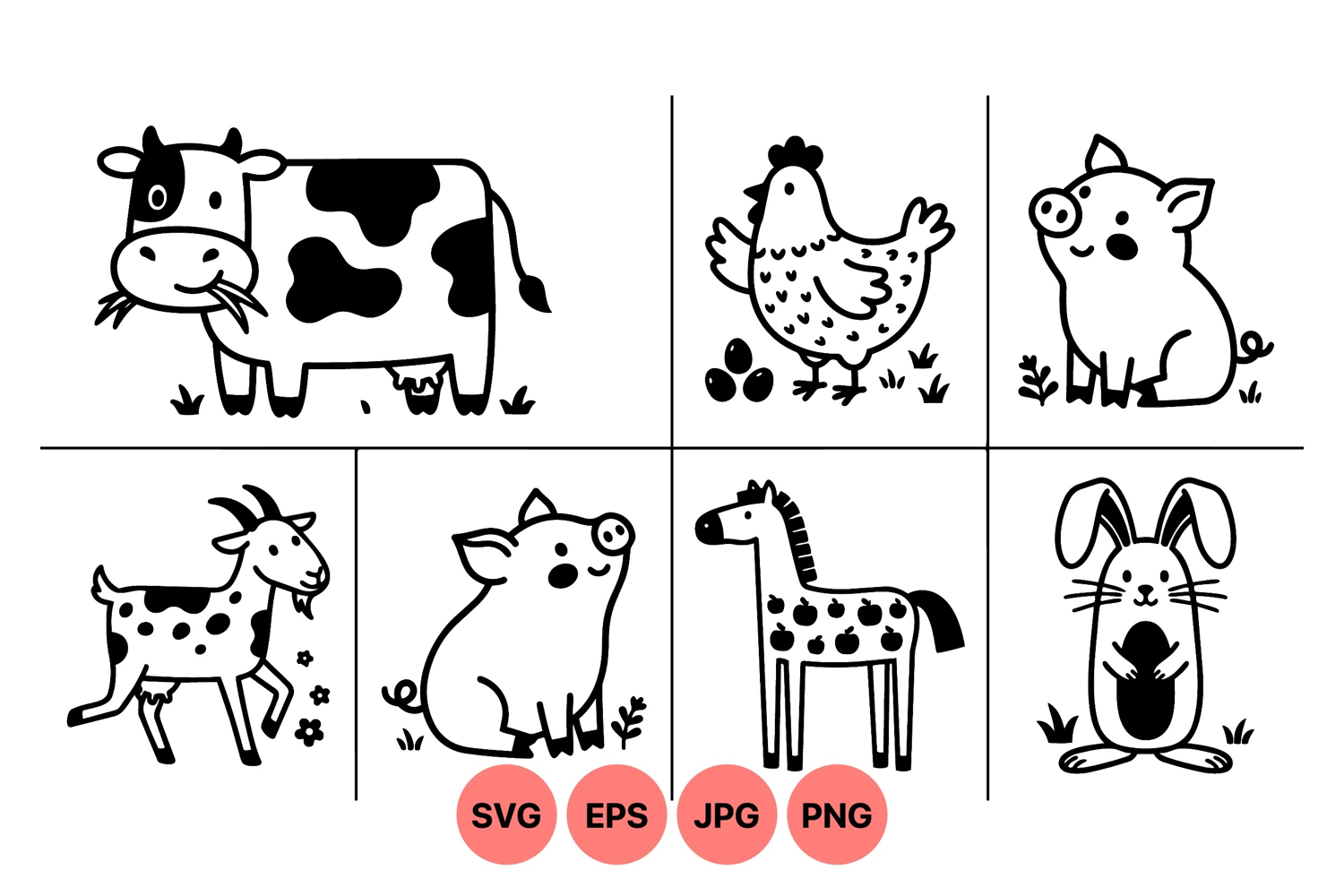 A charming of black and white doodle farm animals features a cow chewing grass, a smiling pig sitting, a walking goat, chicken with eggs, a spotted horse, and a happy rabbit holding a carrot in a simple style.