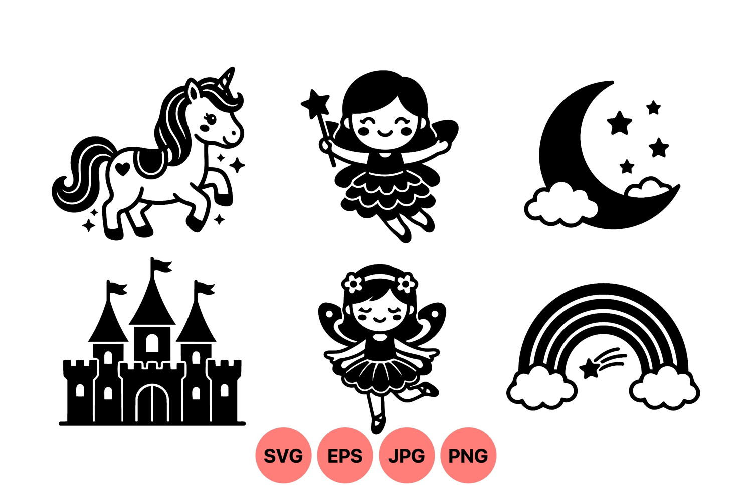 Charming monochrome vector featuring a magical unicorn, flying fairy princesses, crescent moon with stars, a fairy tale castle, and a rainbow with clouds for whimsical children designs.
