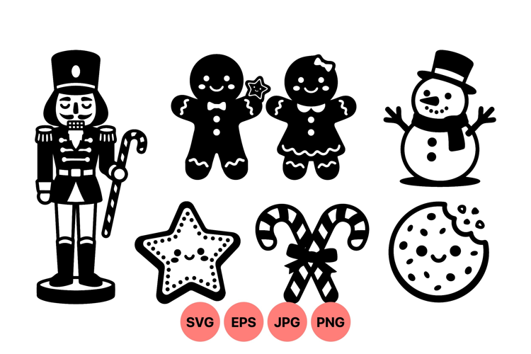 Black and white vector including nutcracker soldier holding candy cane star cookie smiling gingerbread couple snowman and candy cane elements perfect for holiday seasonal designs festive mood