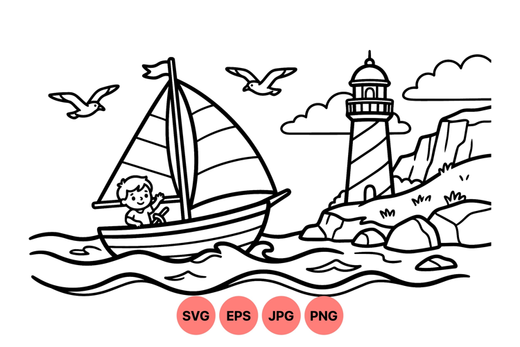 A cheerful boy steers a sailboat along a rocky shoreline with a lighthouse in the background and seagulls soaring above on a breezy day in a simple line drawing style.