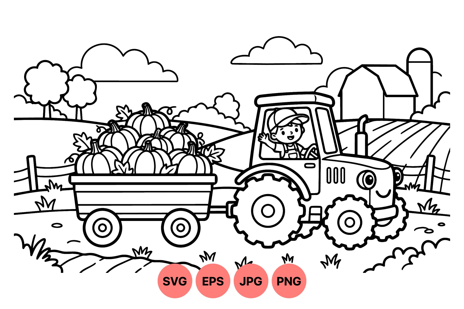 A cheerful boy drives a smiling tractor pulling a trailer loaded with pumpkins across a farm field with barn and trees. black and white line art suitable for coloring and educational use.