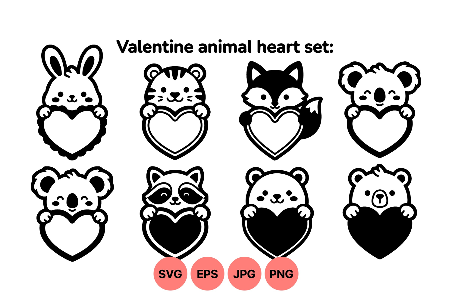 Valentine Svg Files Valentine Day Design Cute Animal Illustration Black And White Animal Heart Clipart Design Love Themed Clipart Valentine Animal Hearts Animal Love Graphics Cartoon Heart Animals Animal Heart Drawings