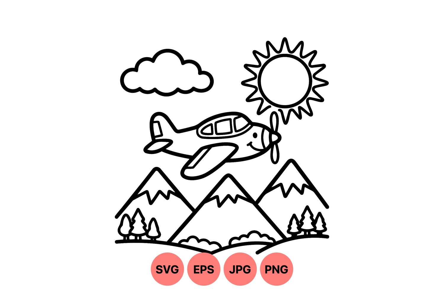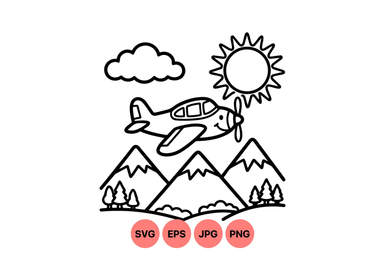 Black And White Svg Kids Cartoon Clipart Mountain Landscape Art Vector Airplane Illustration Airplane Mountain Scene Cute Airplane Svg Outline Travel Graphic Scenic Nature Drawing Playful Hillside Design Sun Cloud Sky Art