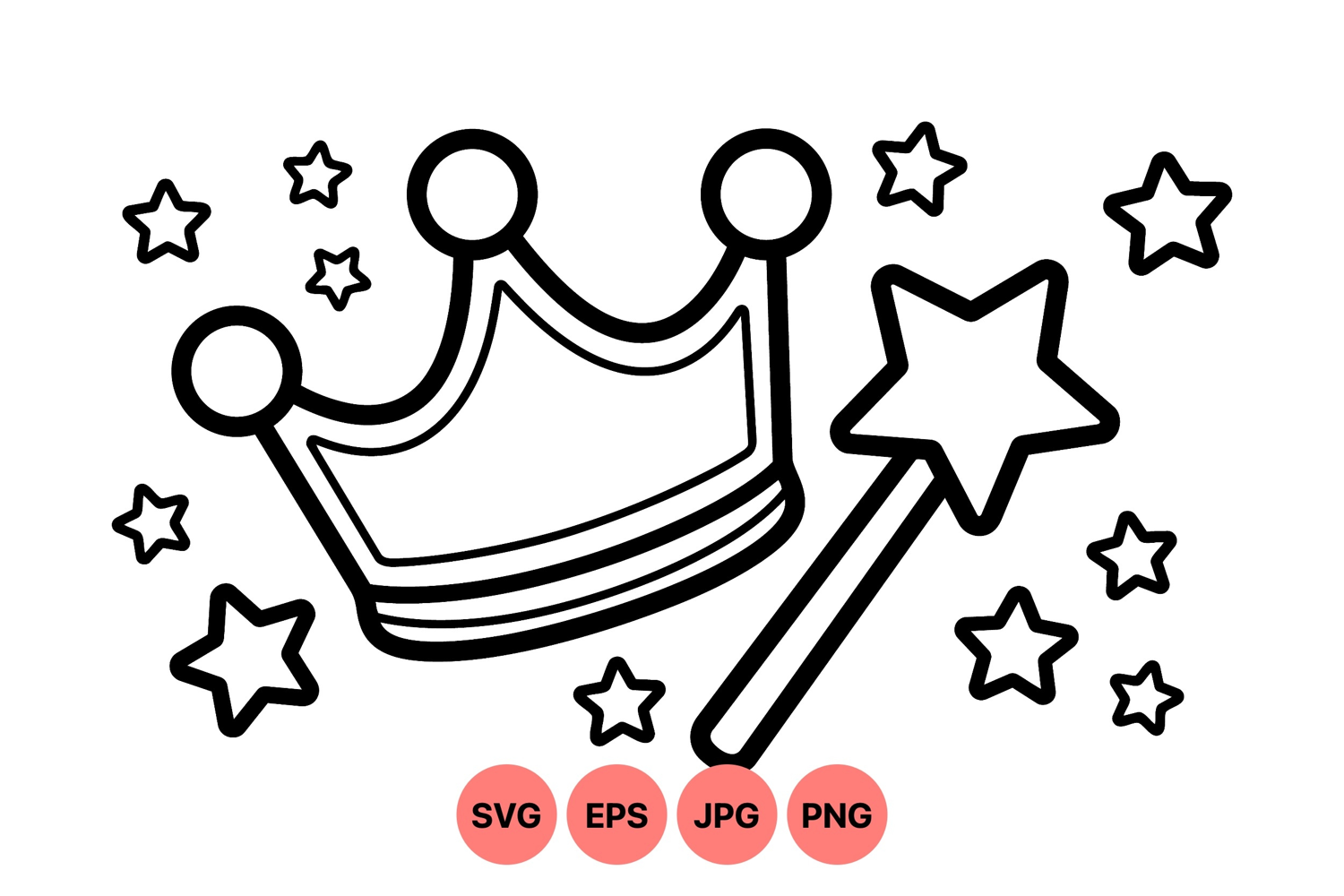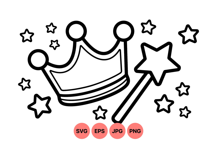 A playful black outline vector features a crown and magic wand surrounded by stars in a simple fantasy style suitable for children themed projects and creative designs