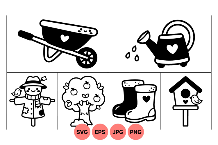 of simple black and white garden themed vector icons featuring wheelbarrow, watering can, scarecrow, apple tree, rubber boots, and birdhouse with heart details in flat style.