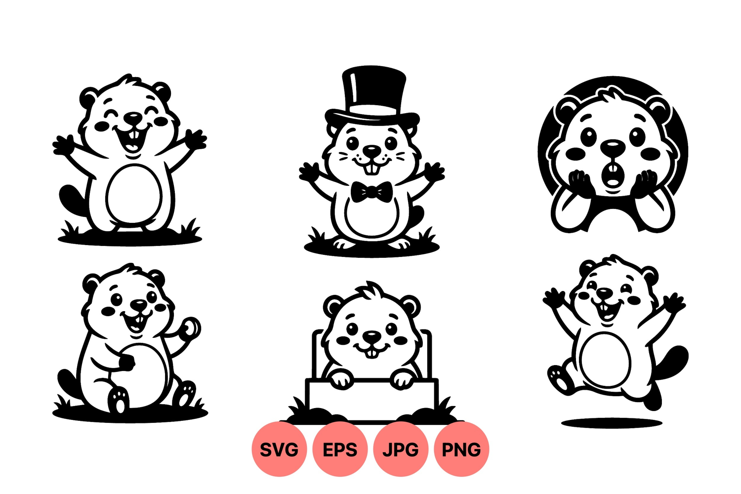 Playful cartoon beaver characters display various emotions and poses including happiness surprise waving sitting and jumping in a fun vector art with black and white style