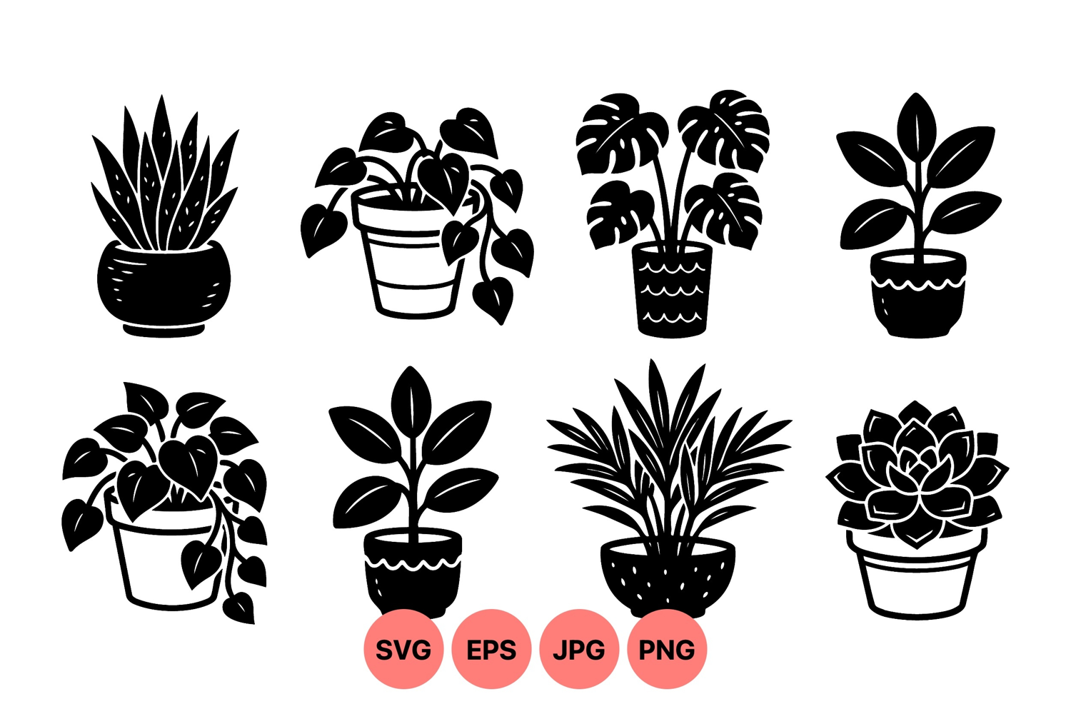 Silhouette vector of eight distinct indoor plants in pots featuring various foliage shapes and decorative patterns ideal for gardening or home decor projects in minimalist style