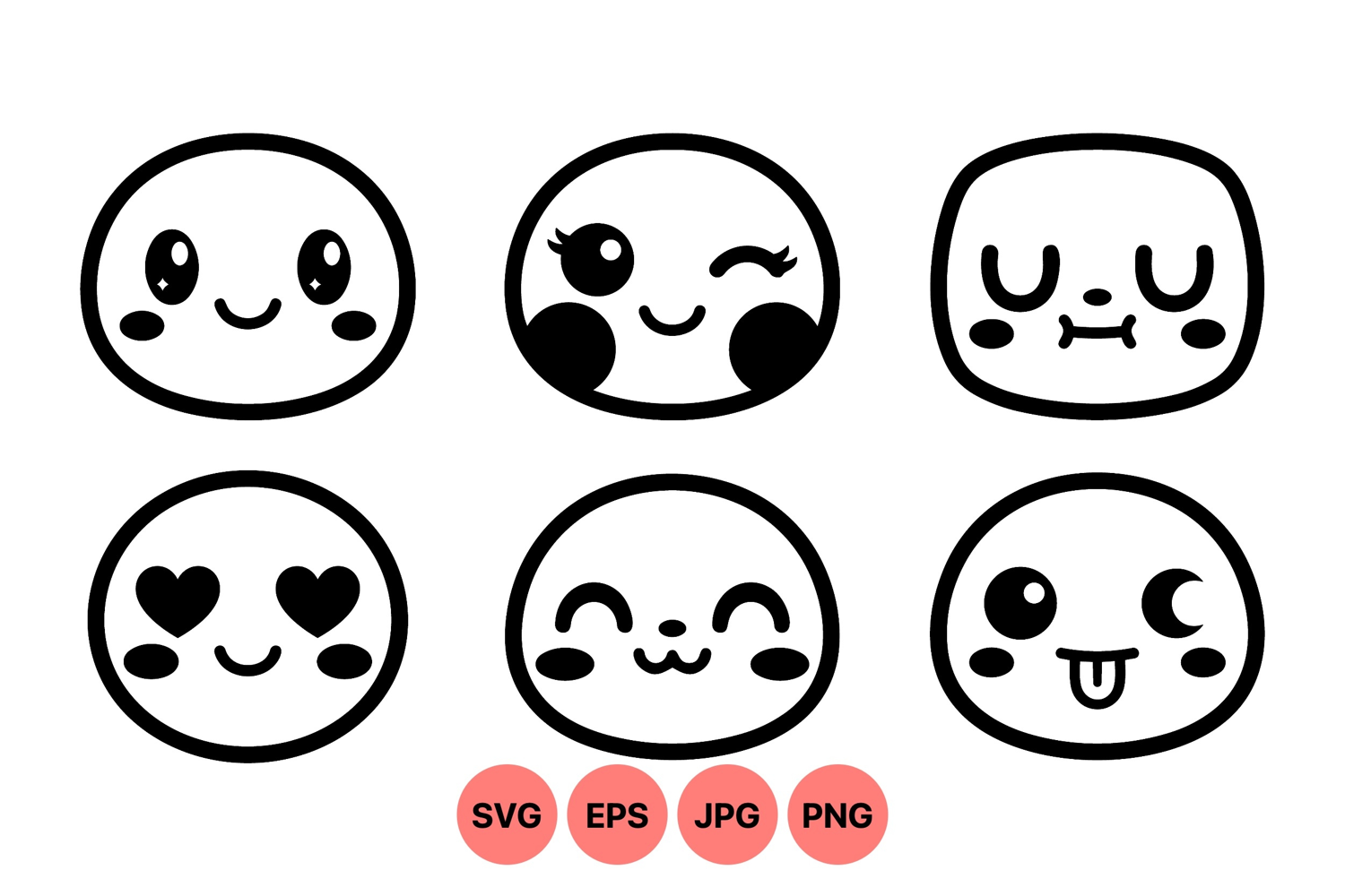 A of six kawaii style emoticon faces with diverse expressions including happy, wink, sleepy, love, joyful, and playful displayed in clean black and white line art vector style