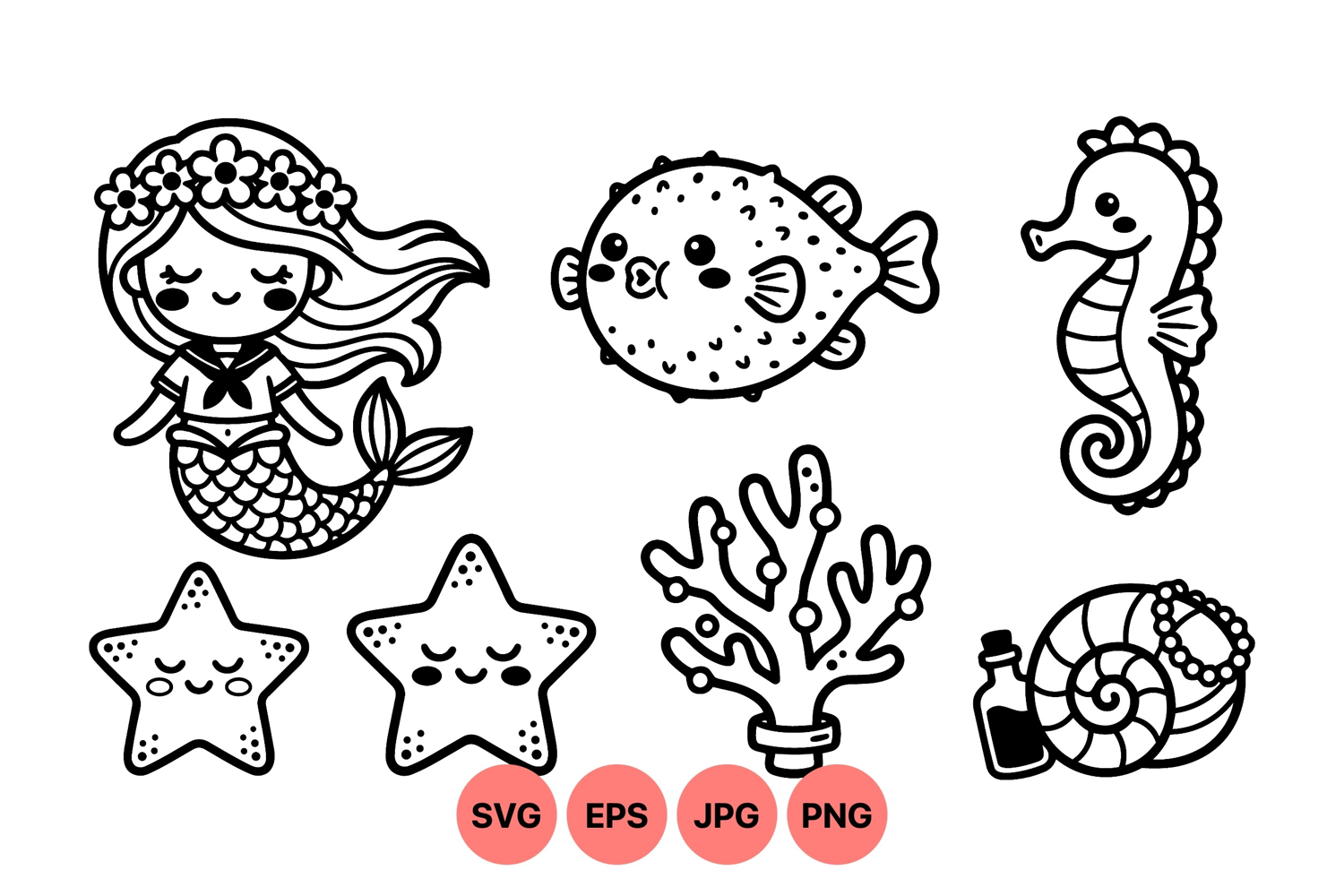 Playful kawaii style vector art featuring a smiling mermaid with flower crown accompanied by starfish sea creatures coral and shell with bottle in whimsical mood