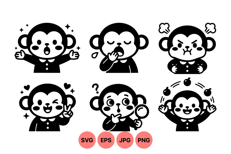 of adorable black and white cartoon monkey faces expressing emotions like surprise yawning anger peace thinking and juggling fruit in vector style suitable for stickers and icons playful mood