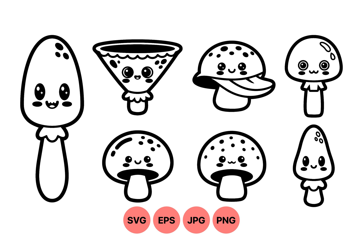 A of kawaii style mushroom illustrations featuring different shapes and happy faces in simple black line art suitable for stickers icons and children designs playful charming mood