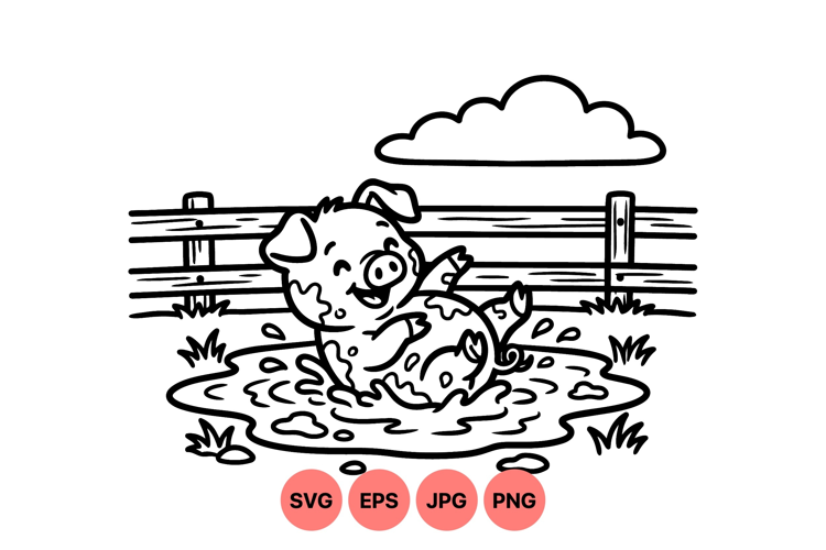 A joyful piglet is playing and splashing in a muddy puddle next to a wooden fence under a cloud with cheerful minimalist line art style happy mood calm outdoors.