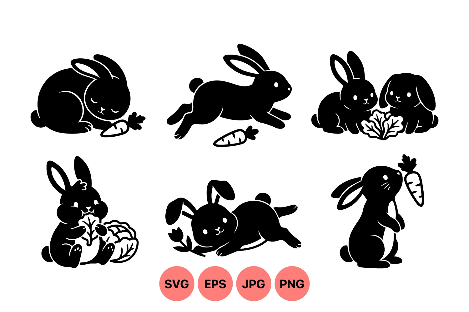 of adorable black silhouette rabbits shown eating carrots and cabbage leaves and engaging in playful actions created as vector art for design projects.