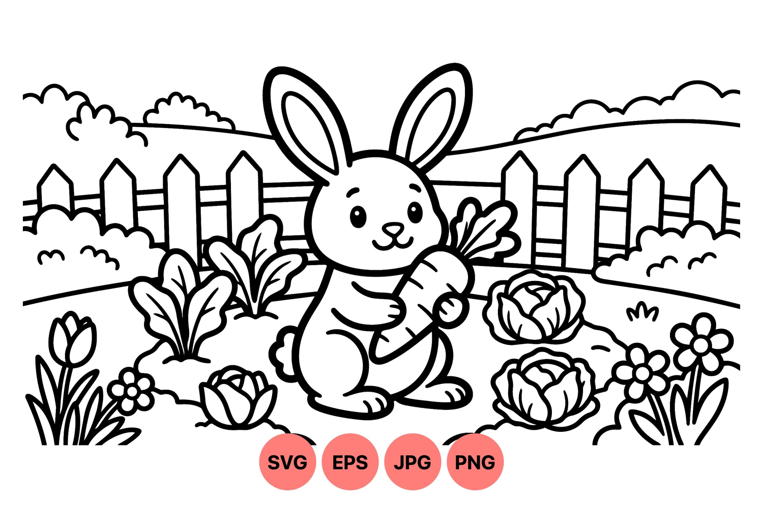 A charming black and white line art vector of a bunny holding a carrot surrounded by cabbage and flowers in a fenced garden setting, perfect for kids coloring book or nature themes.
