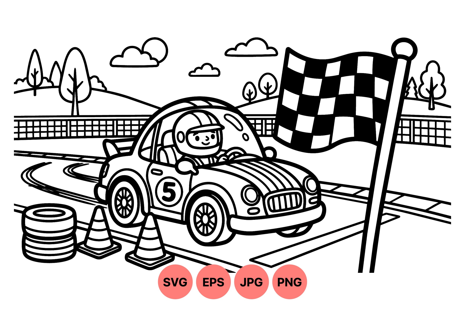 Black and white cartoon style line art depicting a race car with happy driver crossing a checkered finish flag and safety cones on a racing track with landscape background