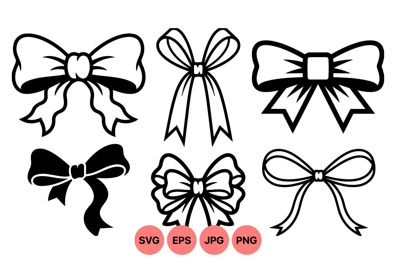 A of six black and white bow designs featuring various ribbon loops and tails in clean line art style suitable for decoration, crafting, and graphic design projects elegant and simple