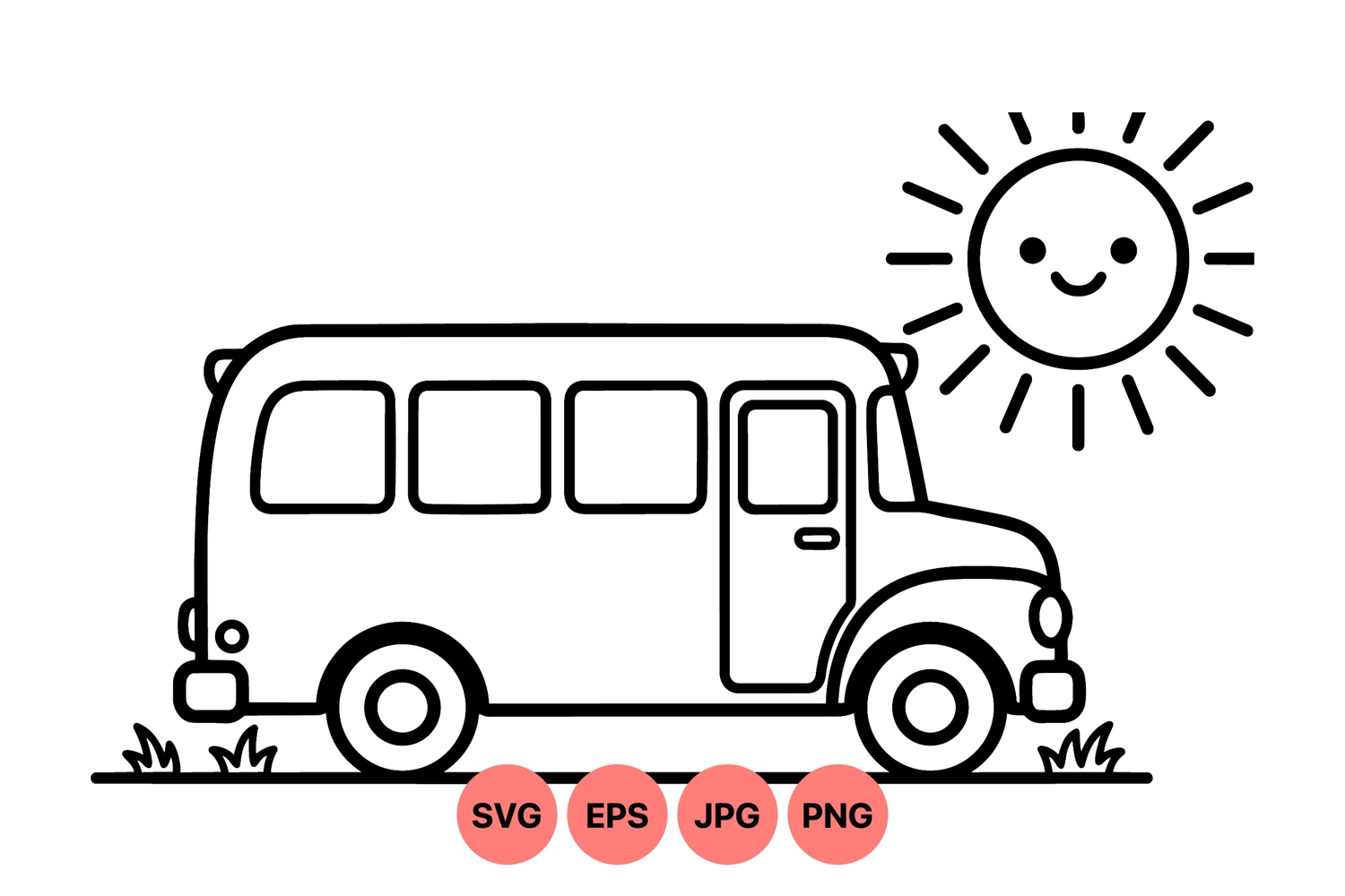 Friendly line drawing shows a school bus next to a smiling sun with grass by the wheels in a clear and simple cartoon style. the mood is cheerful and playful.