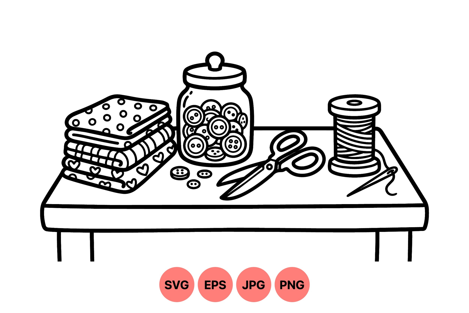 A detailed line drawing showing sewing scissors thread spool jar of buttons and folded fabric on a table illustrating crafting and sewing tools in a simple style