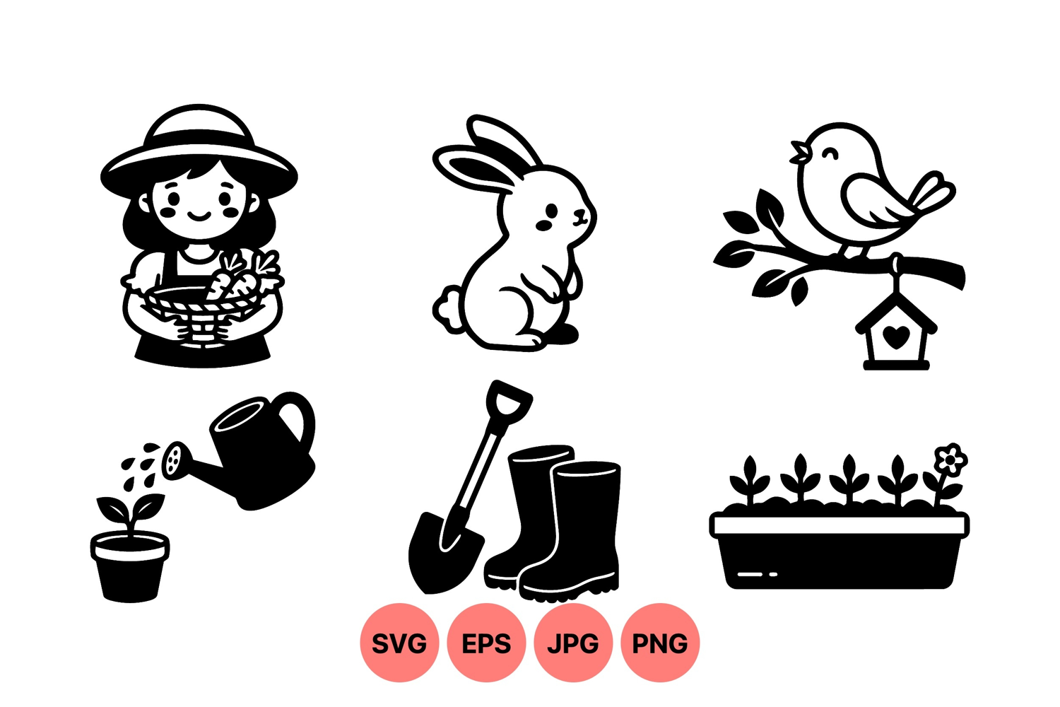Black and white vector art depicting a happy girl with carrots rabbit bird on branch watering a plant shovel and boots with seedlings perfect for gardening themes charming peaceful