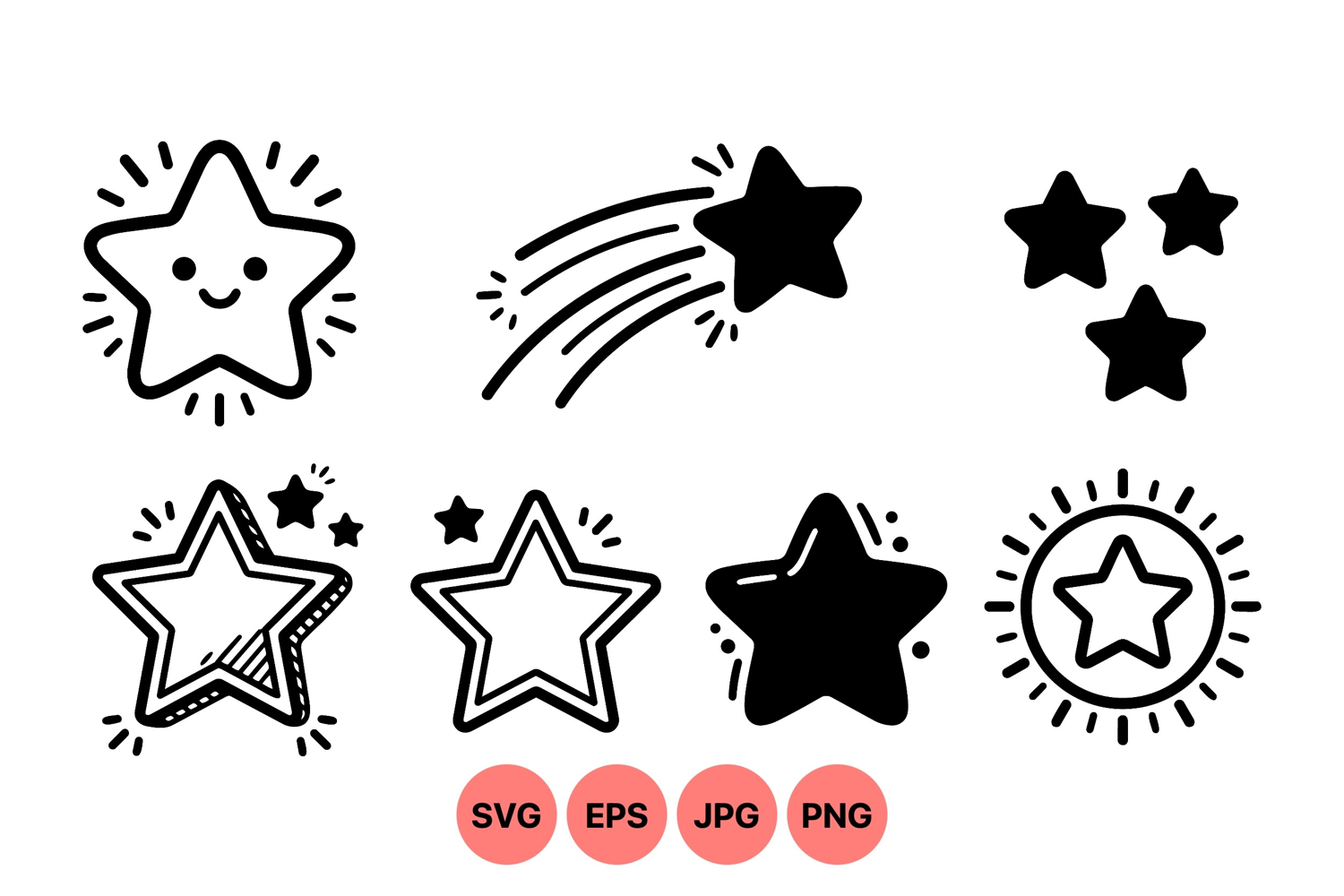 Hand drawn black line art stars includes smiling star cute face shooting star and starburst shapes perfect for decoration and creative design projects playful style