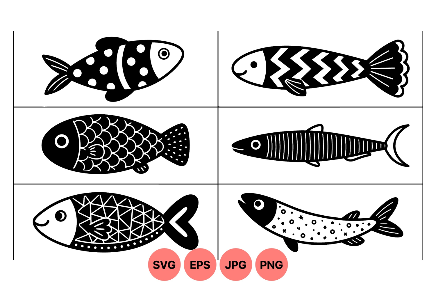 of six unique stylized fish rendered in black and white vector art style featuring geometric, circular, zigzag, and scale patterns on fish bodies creating a bold graphic look