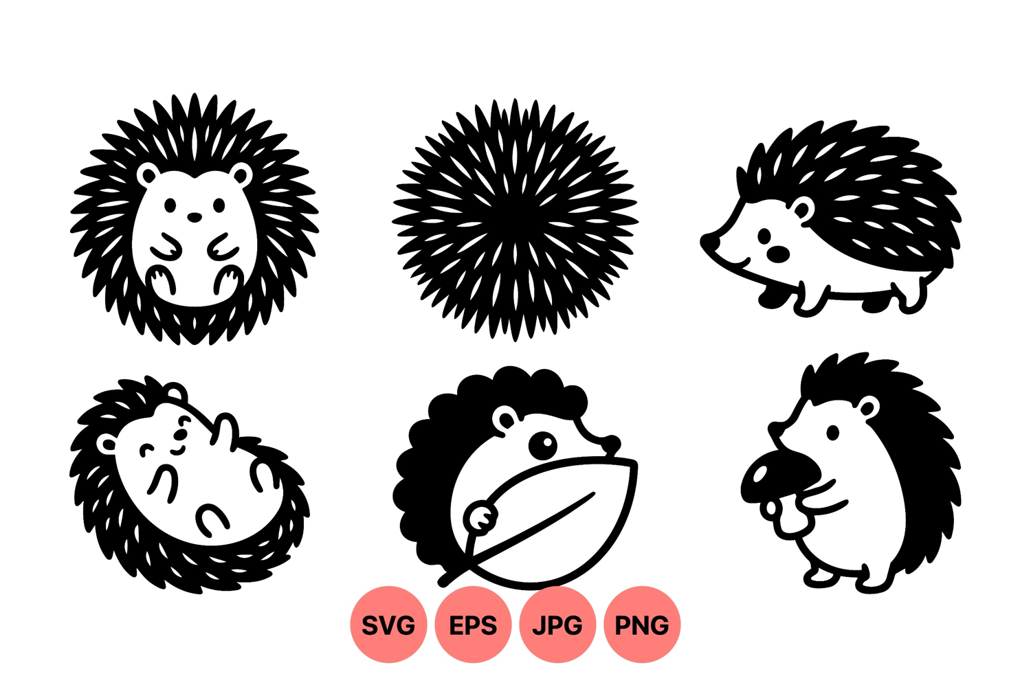 of adorable black silhouette hedgehog icons showing different playful actions including sitting, rolling, holding a leaf and mushroom, illustrated in simple vector style with clean lines.