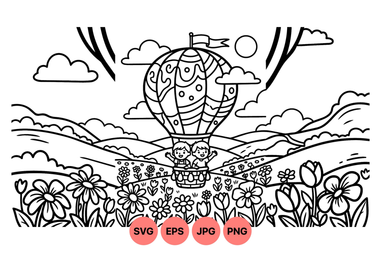 Line art illustration depicts two children waving from a decorated hot air balloon flying above blooming flowers with hills and sun in the background peaceful cheerful scene