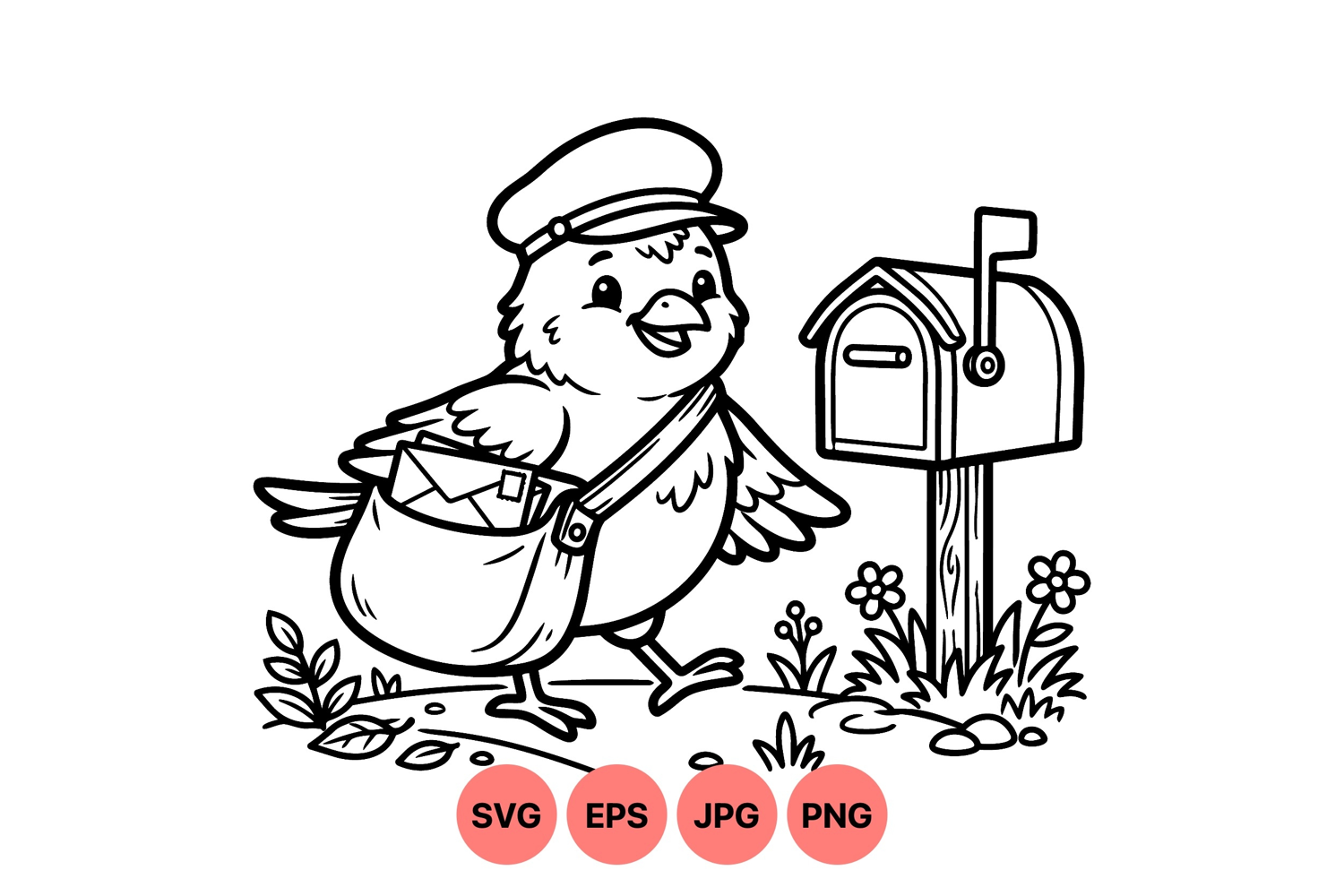 A cheerful young bird wears a postal hat and carries a satchel full of letters walking towards a traditional mailbox surrounded by grass flowers and small stones in line art style playful and charming