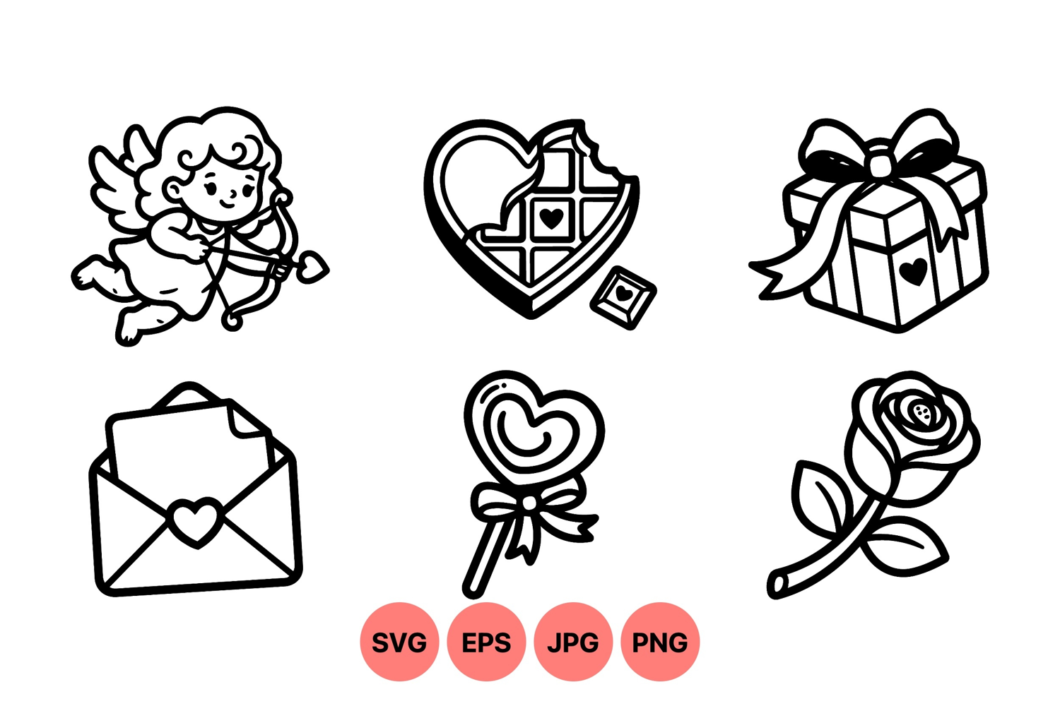 A of black line art icons featuring cupid angel with bow arrow, heart shaped chocolate with one piece bitten, gift box tied with ribbon, envelope with heart seal, heart lollipop tied with bow, and single rose flower.