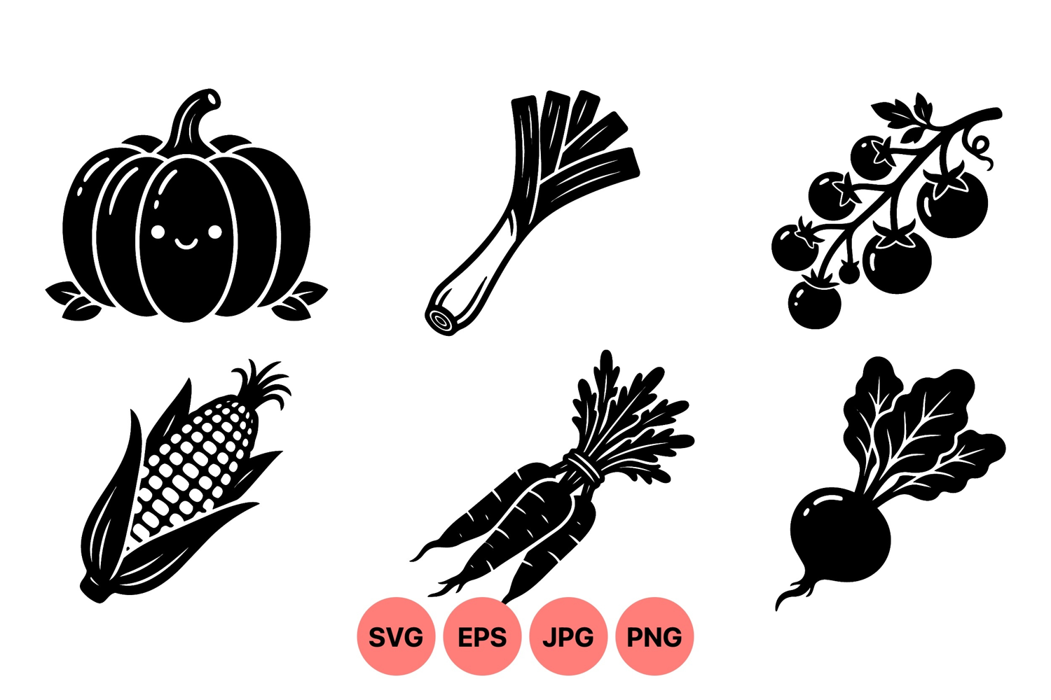 Cute flat design vector icons of smiling pumpkin, fresh corn, ripe tomato bunch, fresh carrots, leafy radish, and crunchy leek in simple black silhouette style for food and agriculture themes.