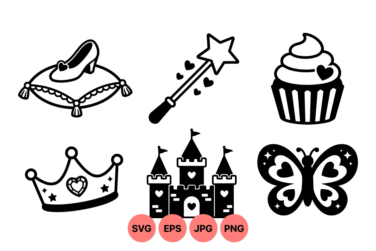 A of black and white vector icons featuring a princess shoe on pillow crown with heart castle magic wand cupcake and butterfly, perfect for fairy tale and children designs.