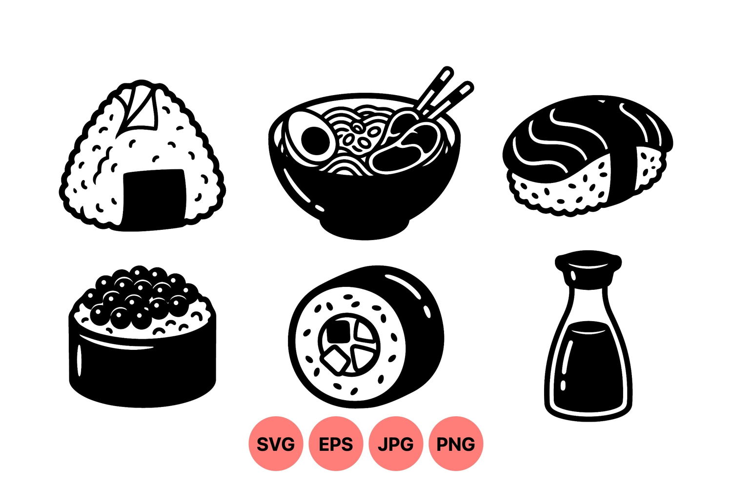 A minimalist black and white vector showcasing traditional japanese food items including sushi, ramen, and soy sauce in simple bold style suitable for menus and culinary designs.