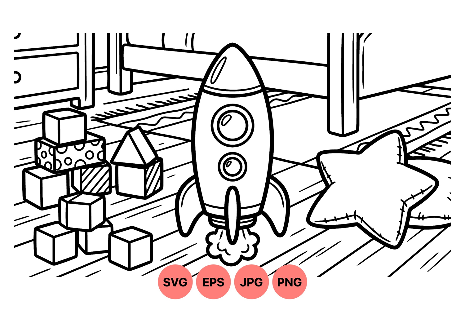 Line art vector shows a toy rocket taking off next to scattered wooden blocks and a stitched star pillow on a wooden floor in a childs room environment peaceful