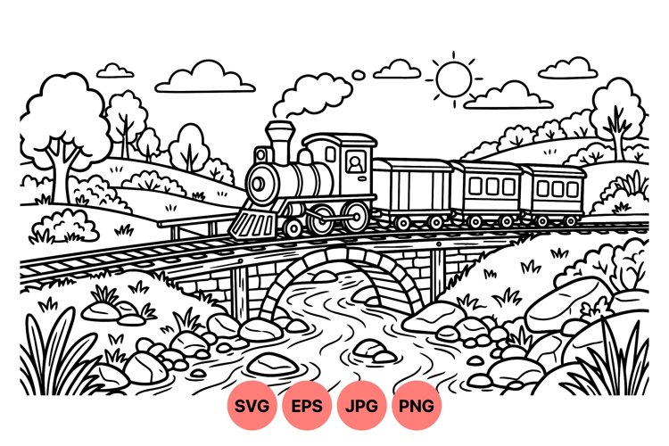 Black And White Drawing Kids Coloring Clipart Steam Train Illustration Vintage Locomotive Clipart Railroad Bridge Drawing Outdoor Landscape Art Rustic Train Graphic Classic Train Outline Scenic Nature Illustration Old Fashioned Engine