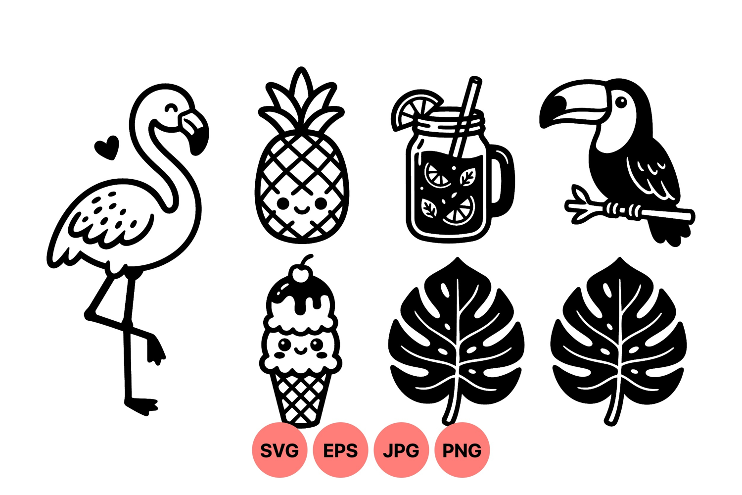 A charming vector art featuring a smiling pineapple, flamingo, toucan, ice cream cone with cherry, lemonade jar with straw and monstera leaves in playful black and white style.