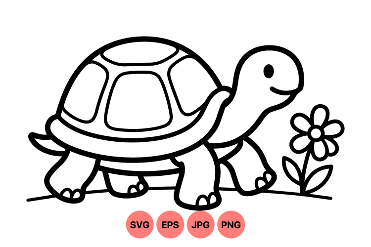 A simple black and white vector illustration of a smiling turtle walking close to a flower designed for coloring and educational use in a playful style.