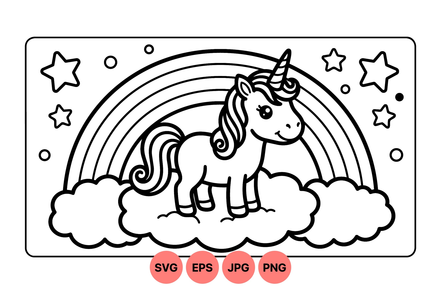 A charming line art vector shows a happy unicorn on soft clouds beneath a rainbow with stars and circles scattered around, perfect for children coloring books and playful designs.