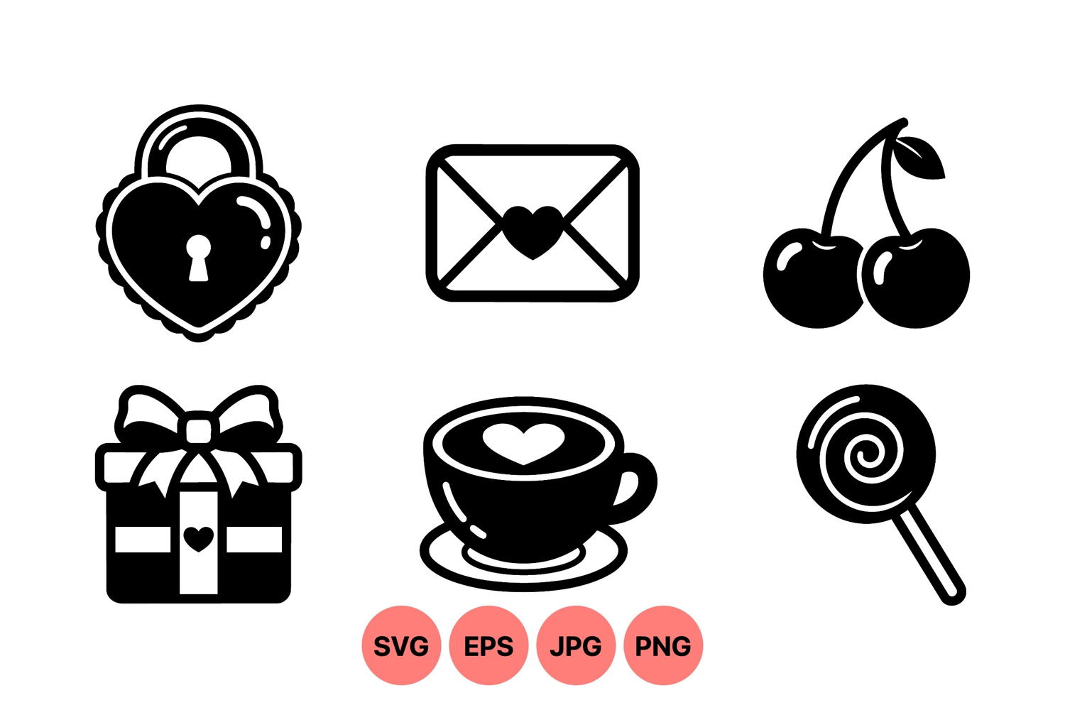 Black and white vector icons depict romantic themed objects including heart shaped lock, envelope with heart, gift box with bow, coffee cup with heart, cherries, and a lollipop, simple and clean design for graphic resources or social media uses, minimalist and bold style.