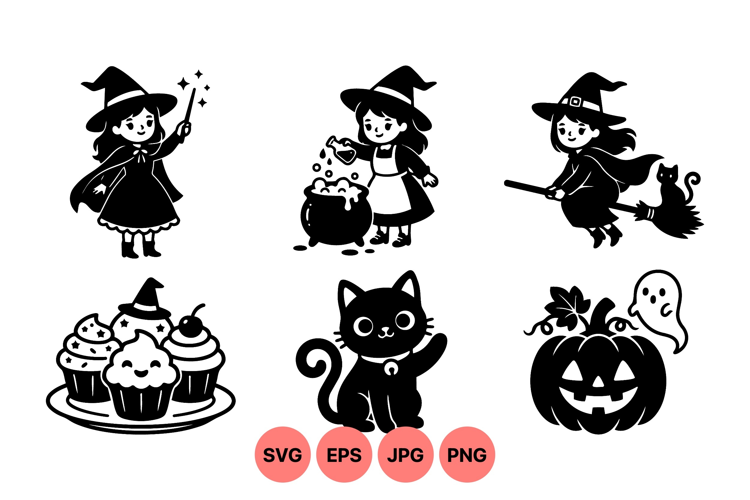 Halloween Party Graphic Black Cat Illustration Halloween Pumpkin Design Spooky Halloween Decor Halloween Ghost Graphic Cartoon Witch Clipart Cute Halloween Treats Magic Wand Drawing Witch Flying Broom Witch Character Clipart
