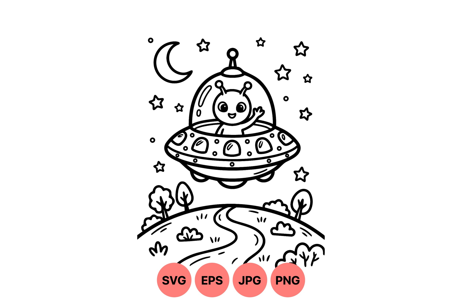Cute Alien In UFO Lineart Illustration Design example image 1
