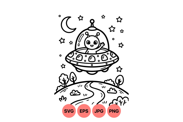 A friendly alien character waves from a detailed flying saucer hovering above a curved scenic landscape with trees under stars and a crescent moon in simple black line art style.
