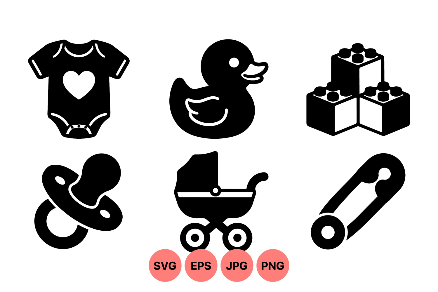 A of bold black vector icons representing baby essentials such as a pacifier rubber duck safety pin stroller blocks and a heart on a bodysuit for infant themes